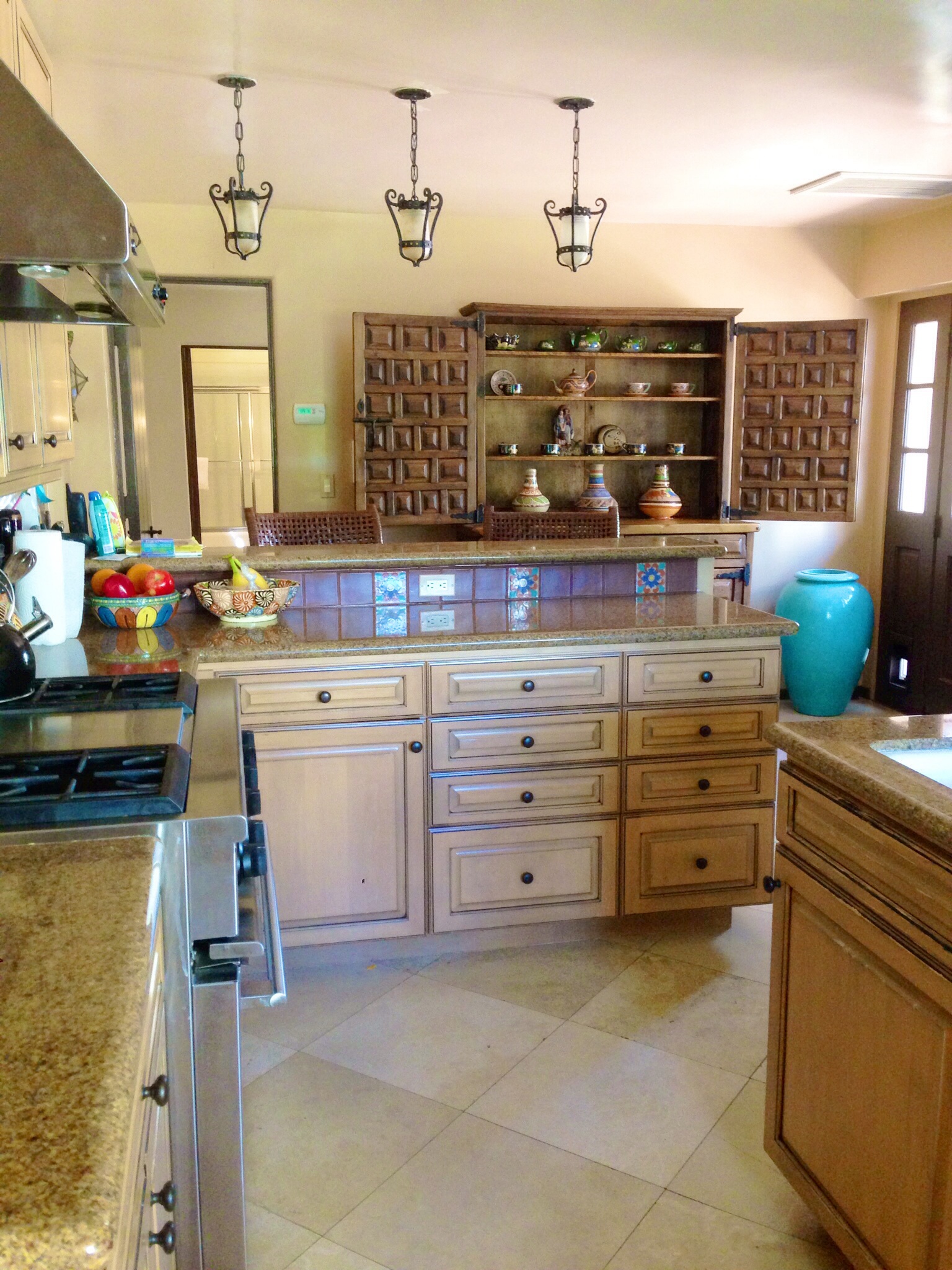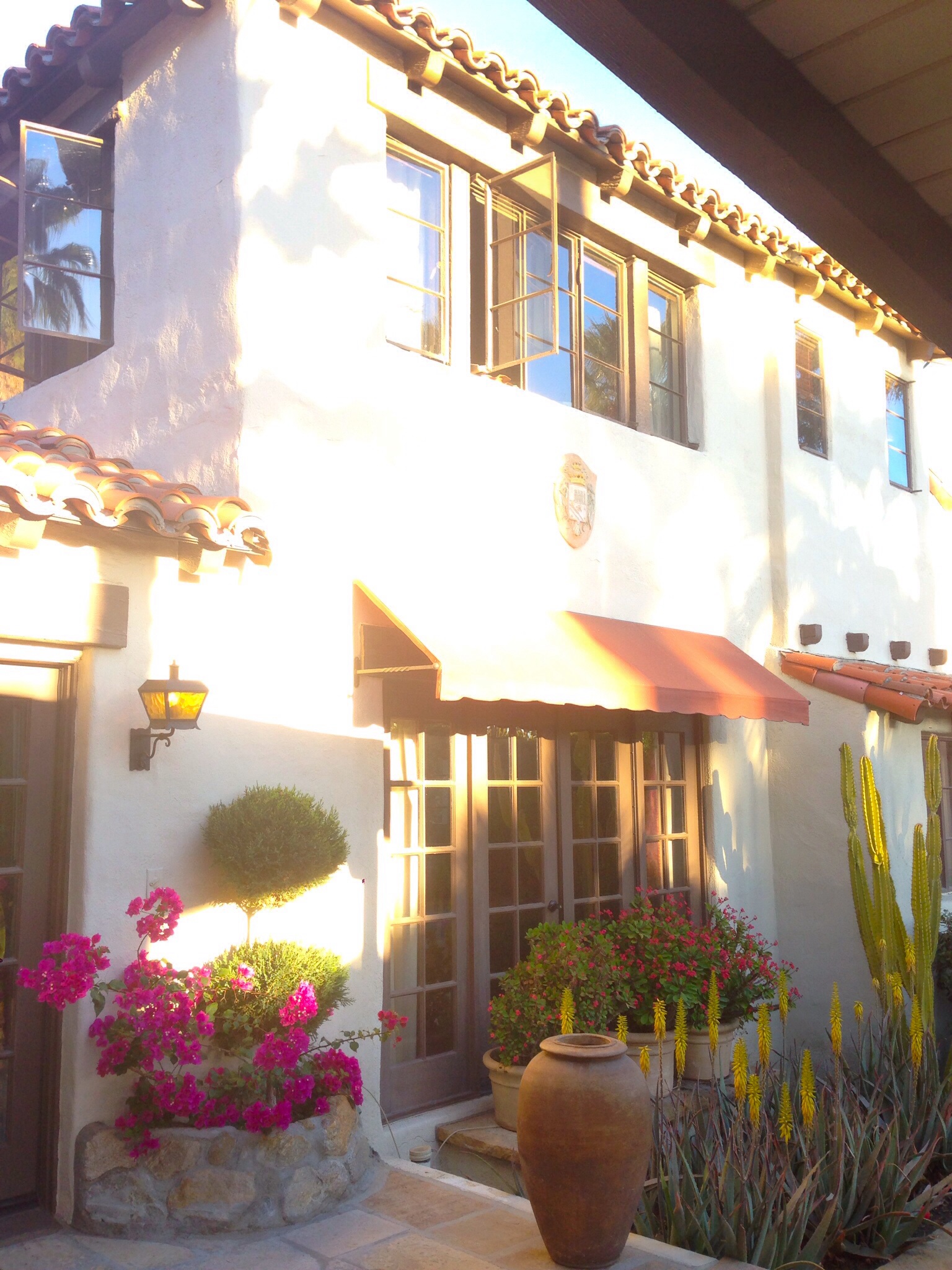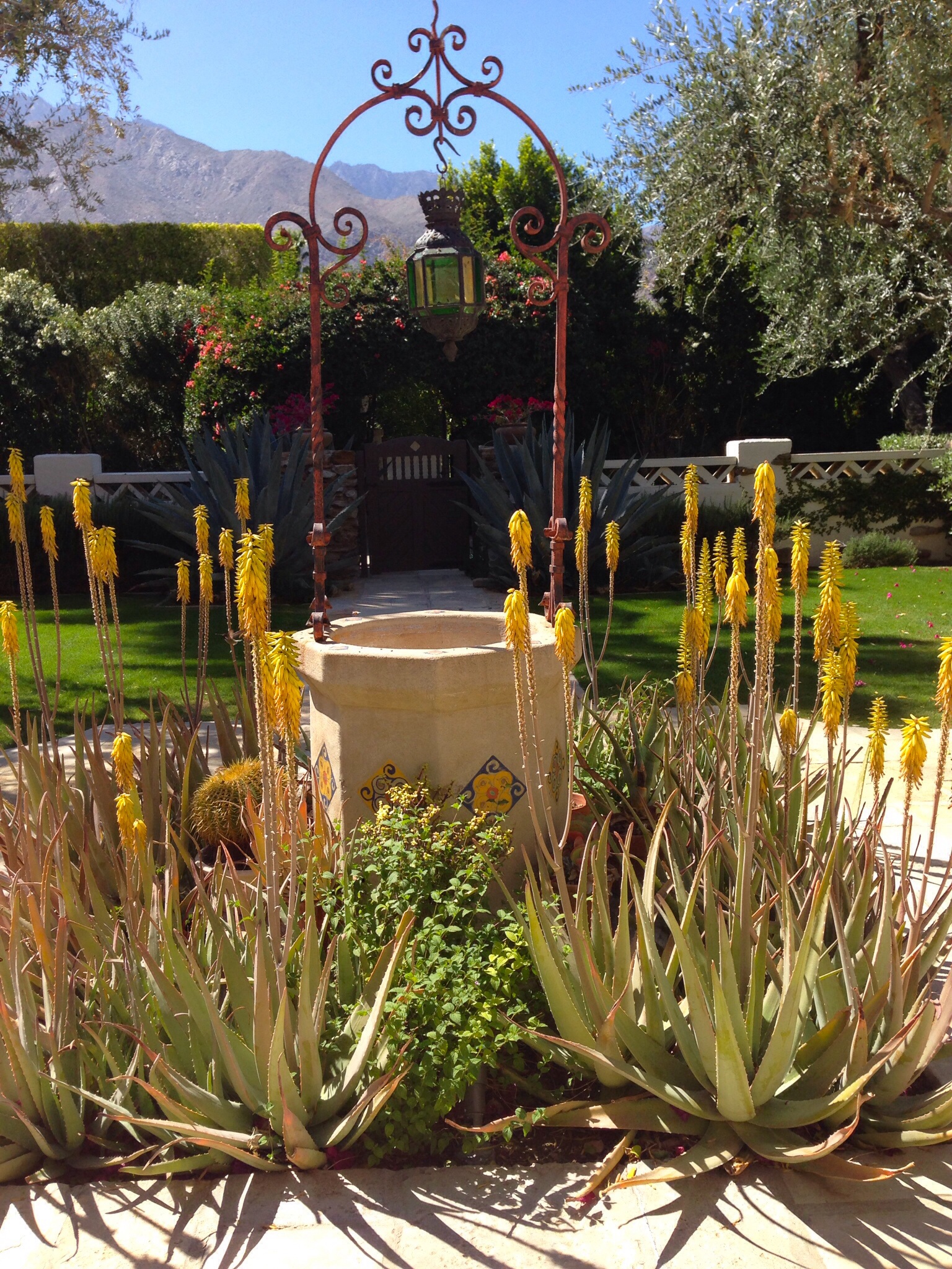 Every year since I was in middle school my family has spent Spring Break in Palm Springs, CA. Even as my sister and I grew older, went off to college, got married and had families of our own, my parents still upheld the tradition of bringing everyone together for a sunny vacation. At first we’d rent a small time-share condo that was close to town so that us girls wouldn’t have to rely on my parents to shuttle us back and forth when we wanted to go shopping or seek out boys our own age. Over the years as our vacation needs evolved (private pool, separate bedrooms for the kids, enough bathrooms for everyone) we graduated to a larger house. Not all have been great (I distinctly remember having to sleep in a room with a creepy clown motif one year), and others have wonderful. This year is spectacular. Beyond spectacular! The house (palace, really) is located in a part of town called “Movie Colony” named because of the high profile neighbors it once boasted. It’s filled with beautiful artwork, Mexican pottery, and unique mementos from famous guests that once visited. It was built in 1929 in the Spanish-Colonial style that was (and is) so popular in the area. It. Is. Beautiful! But it’s not about the house (mostly not), it’s about the fun had within. What once started as a week of excessive tanning and boy-hunting has slowly evolved into a relaxing retreat for loved ones to catch up, swim, and enjoy good food. Below are photos I took around the property this morning. Later this week I’ll be posting more photos and recipes for sunny, light, California inspired dishes. Enjoy – I know I will be!