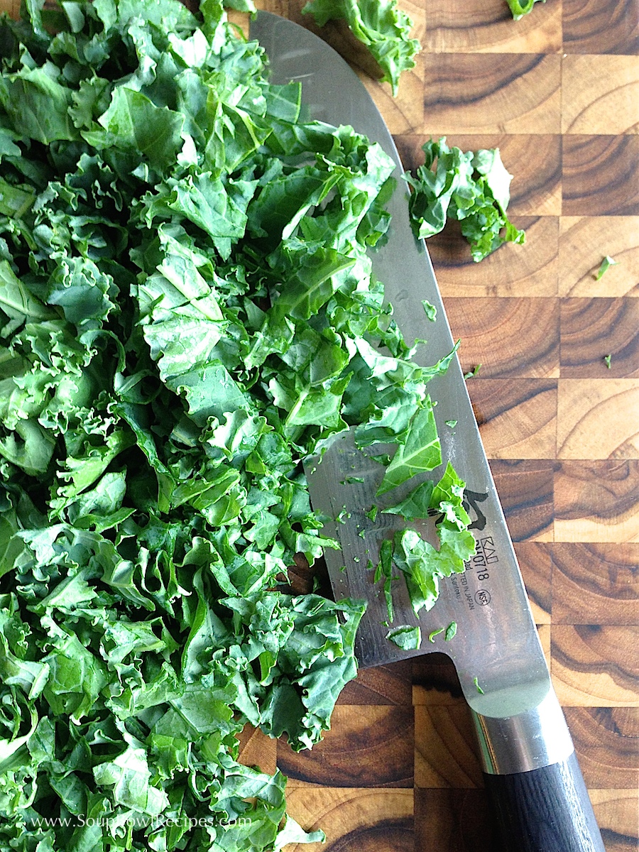 With a sharp knife, remove the center stem from kale and roughly chop. Place in a large salad bowl.