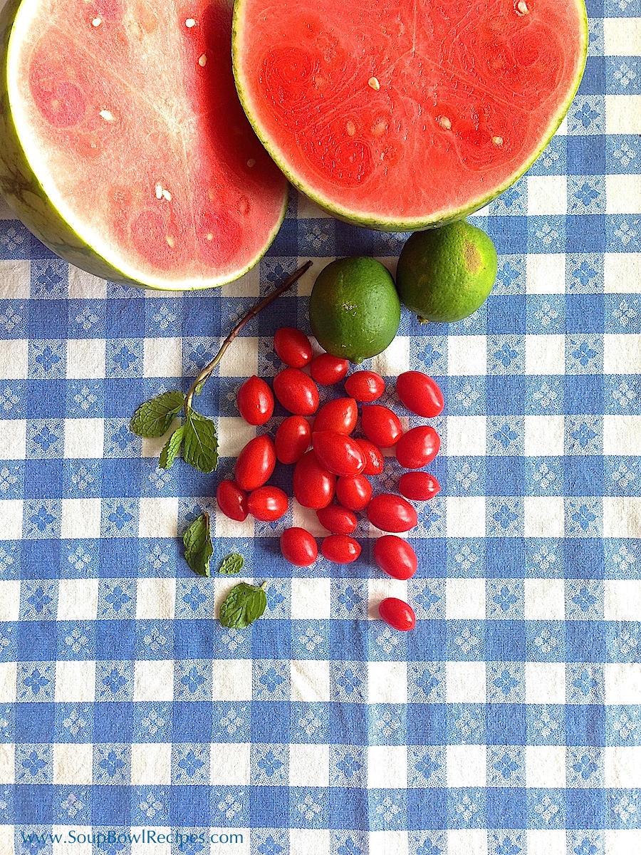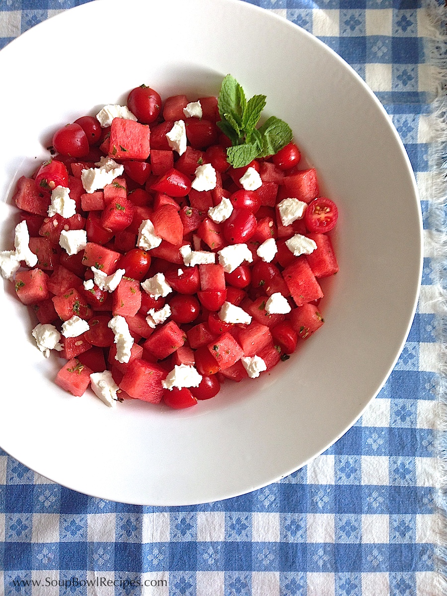Watermelon-Tomato Salad with Mojito Dressing and Goat Cheese