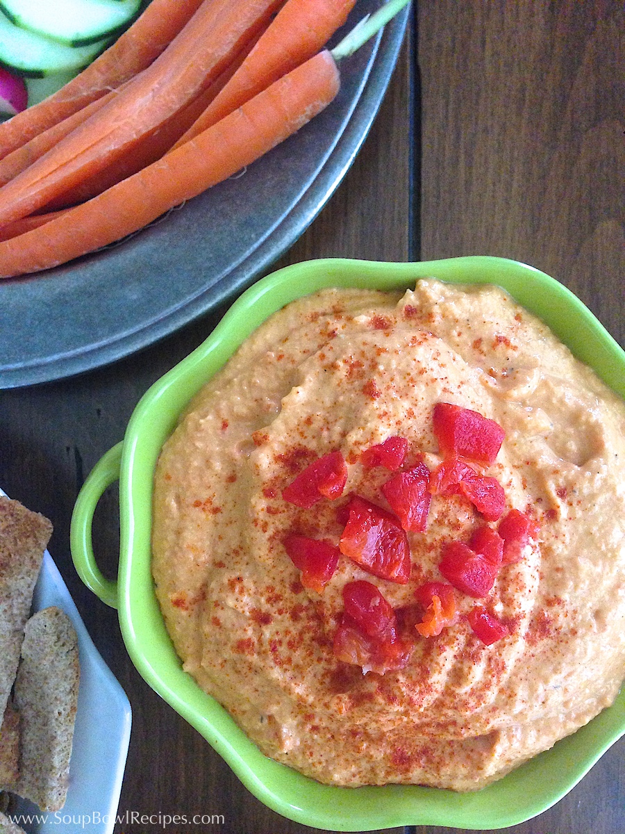 Last weekend my family was invited to and outdoor gathering where I was asked to bring an appetizer. Easy enough, I thought; I have tons of appetizer recipes that I’ve been wanting to try out. The trick, however, was figuring out what to make that didn’t require last minute cooking, yet could stand up to our sweltering Texas heat. A quick rummage through my pantry turned up a jar of roasted red peppers and a can of chickpeas, and I instantly knew that I had the beginning of an awesome summer dip. Using my homemade hummus recipe as a base, I only had to tweak a couple ingredients to create a whole new flavor. Zestier and smokier than the original, this hummus dip will help brighten any BBQ or potluck – rain or shine!