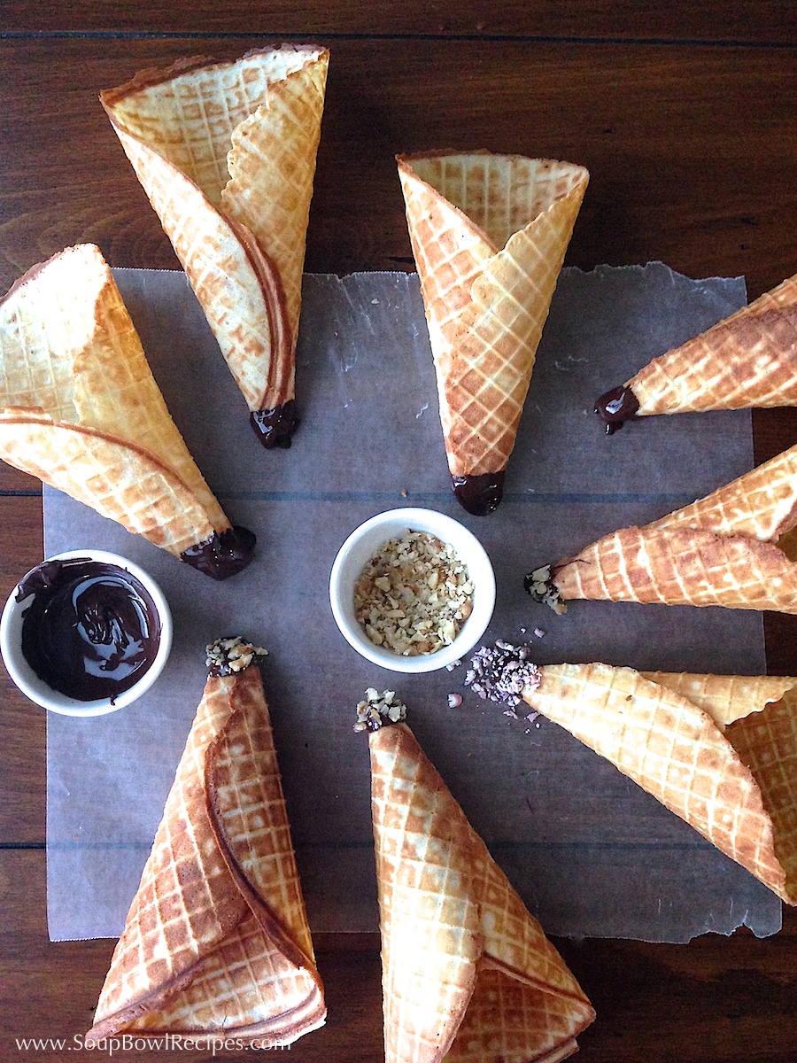 Once cones have cooled, dip the tips into melted chocolate (this will seal the bottom of the cones, preventing the melting ice cream from dripping all over your hands). Either leave plain, or roll chocolate-covered tips into chopped nuts or sprinkles. Transfer cones to a piece of wax paper and place in the refrigerator until chocolate hardens, about 10-20 minutes.
