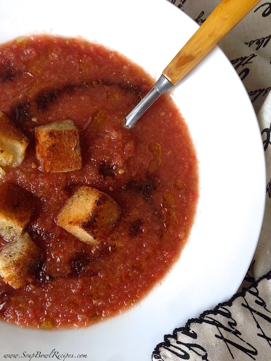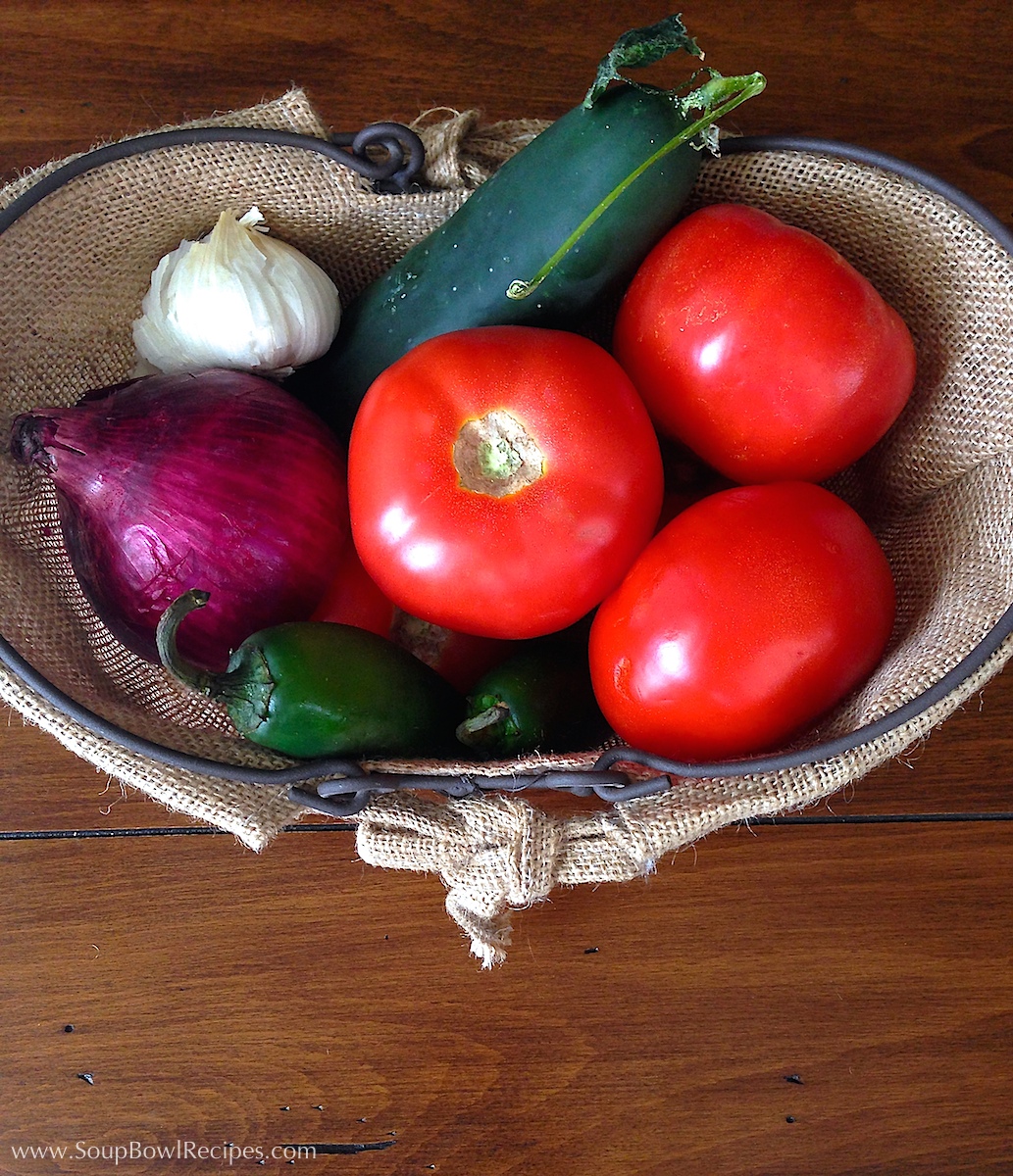 When I created this blog nearly 8 months ago, I was living in Kansas and knee-deep in one of the bitterest winters the Mid-West had seen in years. At the time, my family and I were surviving on weekly soups and hearty meals to keep ourselves warm, so it seemed perfect to name my food blog SoupBowlRecipes! It was an obvious choice for someone who was freezing and didn’t have the foresight to consider that they would eventually move to one of the hottest states on the planet, where, for at least 6 months out of the year, the thought of making soup is unbearable. And now here we are in Texas, in mid-August, where the temperature for the past few weeks has been hovering around 100°F and shows no signs of breaking. So what’s a girl supposed to do? Well, what every good soup blogger does when life hands them lemons – make lemonade! Or in this case, I’m taking my farmers’ market tomatoes and making a refreshing gazpacho!