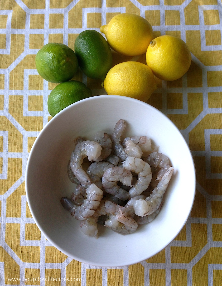 Add shrimp to a shallow bowl and pour lemon and lime juice over top, covering shrimp completely. Allow to sit.
