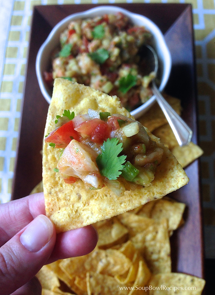 Roughly dice shrimp and place in a medium-size serving bowl with other diced ingredients, stir to combine. Taste and season with more paprika, salt, and pepper if needed. Sprinkle with cilantro leaves and serve with yellow corn tortilla chips for dipping.