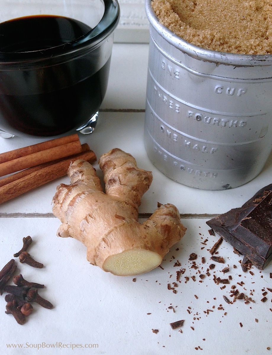 In a medium bowl, sift together flour, cocoa, baking soda, dry spices, and salt; set aside.
