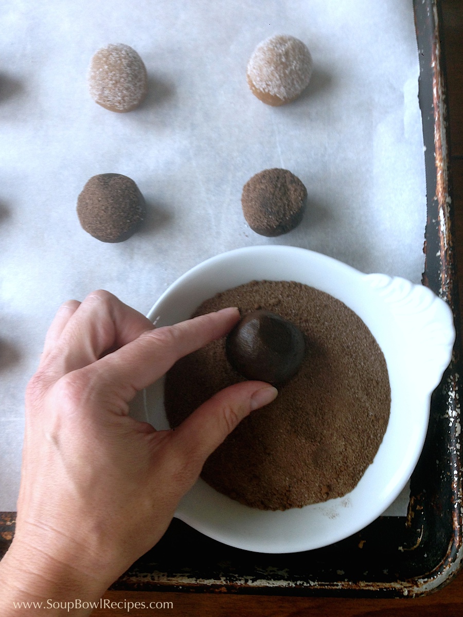 Dip the chocolate side of the cookie ball in sugar/cocoa mixture and the regular side of the cookie ball in plain granulated sugar, and place on prepared cookie sheet, spacing 2-inches apart. Bake cookies for 10-12 minutes, or until a toothpick inserted into the middle of a cookie comes out clean and tops are nice and crackly.