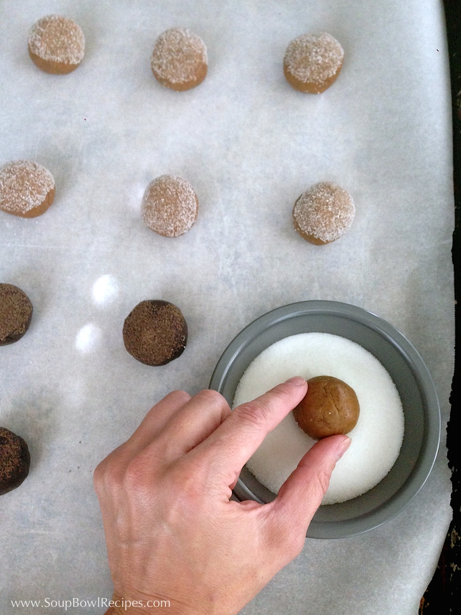 Preheat oven to 350°F and line two baking sheets with a piece of parchment paper. Pour ¼ cup granulated sugar into a bowl and set aside. Remove dough from refrigerator (note: if you refrigerated your dough longer than 1-hour, allow it to come to room temperature for 30 minutes before proceeding). Scoop 1 heaping tablespoon of dough into your hands, and, using your palms, roll dough into balls. Roll the balls in sugar and place on prepared cookie sheet, spacing 2-inches apart.