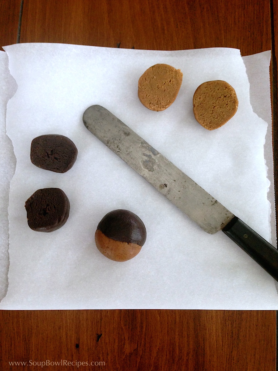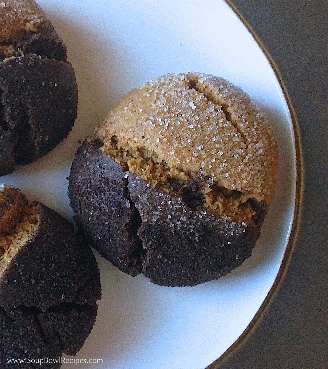 To achieve this half-and-half cookie, simply make one batch of regular Gingersnap dough and one batch of Chocolate Gingersnap dough (or if you don’t want to end up with 6 dozen cookies, make half a batch of each). After removing dough from the refrigerator, scoop 1 heaping tablespoon of dough into your hands, and, using your palms, roll dough into balls. Cut each ball in half, then press one half of regular Gingersnap dough into one half of Chocolate Gingersnap dough, and roll together until sealed.