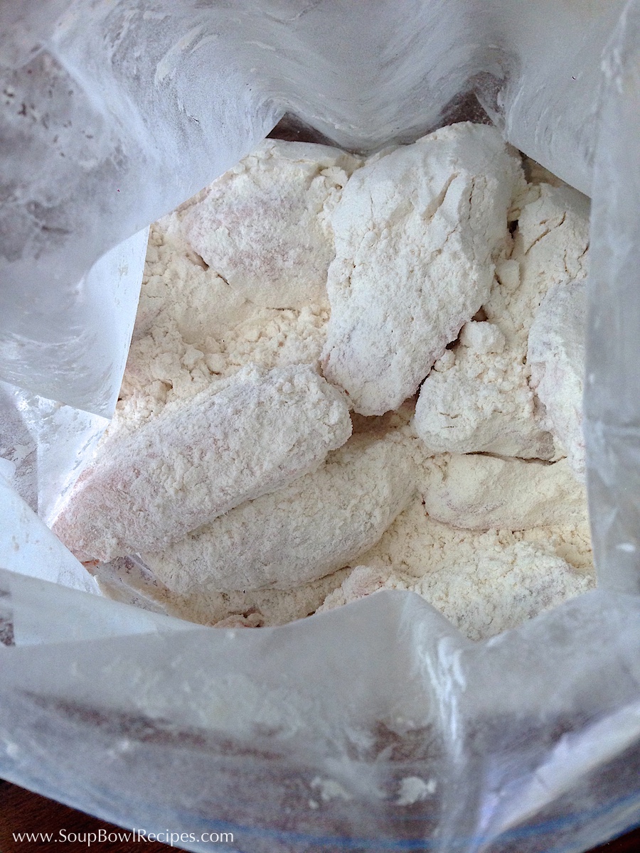 In a large bowl toss the wings with the oil, and salt. Place chicken pieces into a large plastic shopping bag, and add the flour. Shake to coat evenly (you may need to work in two batches).