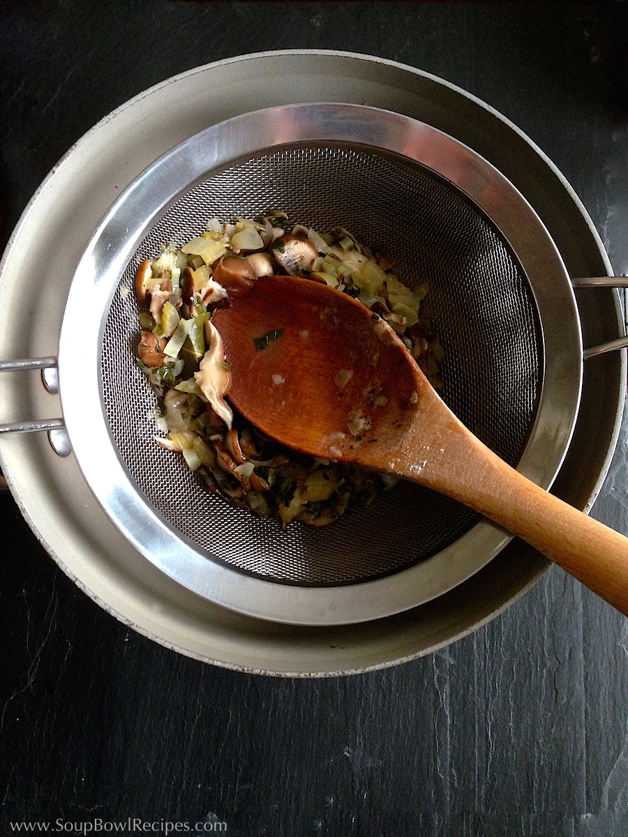 Melt butter in a large soup pot set over medium heat. Add the ¾ pound of sliced mushrooms, celery, onion, and leek and sauté until vegetables soften, about 10 minutes.