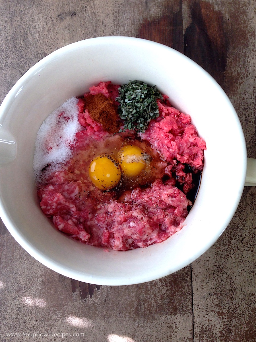 Also to the bowl of onions and pears, add the meats, eggs, Worcestershire, sage, cinnamon, salt, and pepper.