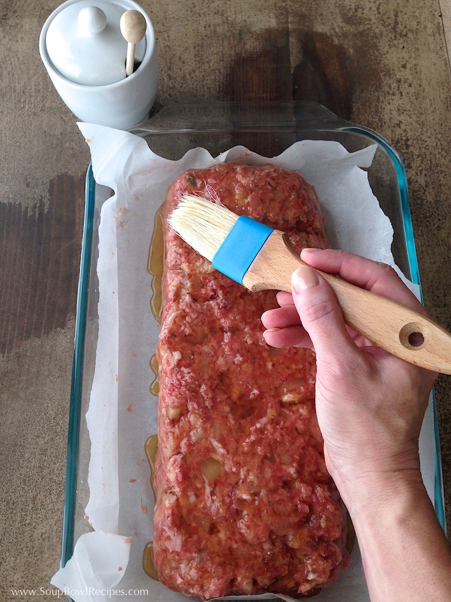 Line the bottom of a 9×13-inch baking pan with parchment paper. Transfer the meatloaf mixture to the baking pan and form into roughly a 10×4-inch rectangular block. Drizzle 2 Tbsp of honey evenly over the top and use a basting brush to smooth until completely covered.