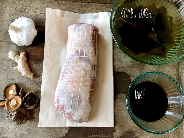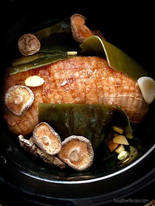 Place pork in crock pot along with kombu dashi and tare (if using), chicken stock, garlic, ginger, and dried mushrooms. Cover and set to low heat for 8 hours (of if you’re in a hurry, high heat for 4 hours).