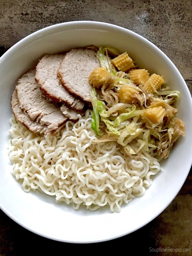 4. Ladle stock over pork, veggies, and noodles so that the stock just reaches the level of the noodles.