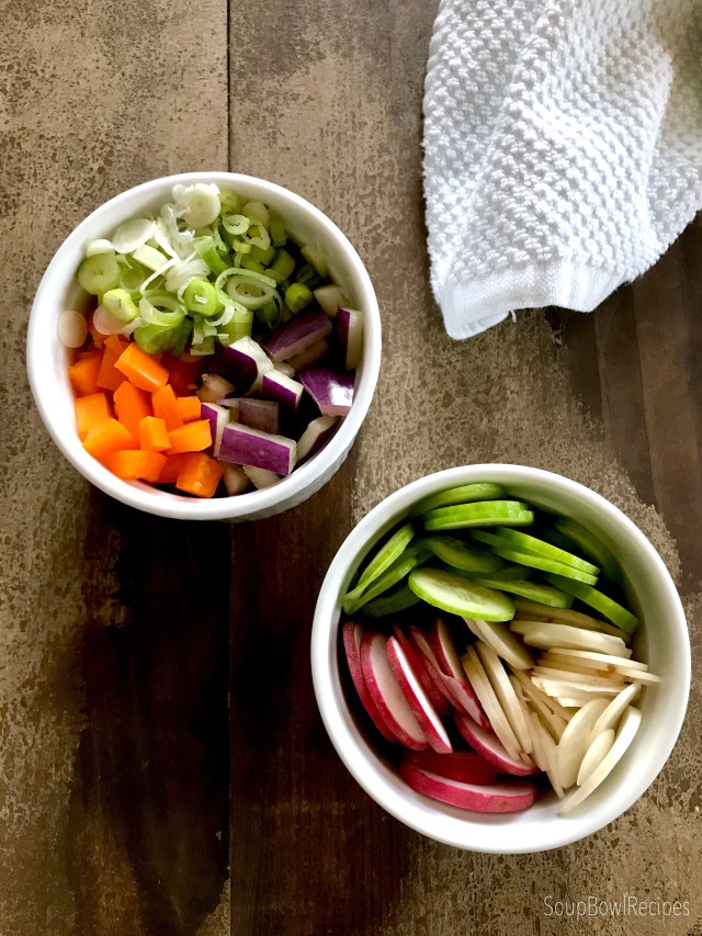 And just to entice you even further, this recipe is super flexi, so you can adapt it to whatever produce you have in your fridge, or, better yet, whatever’s fresh at your local farmers’ market. This week I picked up some radishes, a bunch of Hakurei (Japanese turnips), a burpless cucumber (there were other cucumbers there, but, come on, burpless cucumbers – how could I resist?), scallions, orange & purple bell peppers (purple!), a huge bunch of fresh basil, and a gnarly, dirty bulb of garlic.