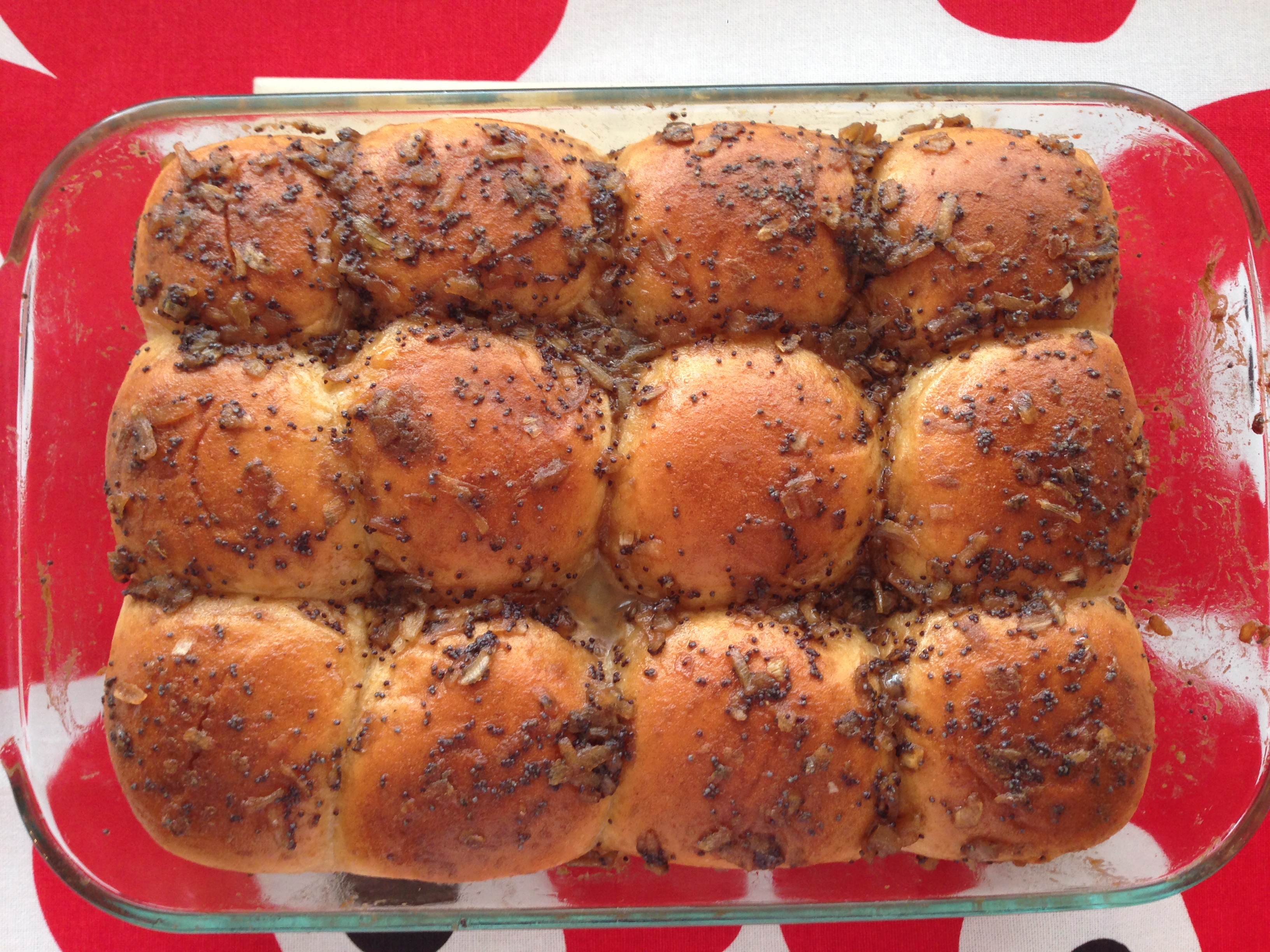 Lightly mist 2 – 9×13 inch baking dishes with cooking spray. Lay bottom half of rolls in the first dish.