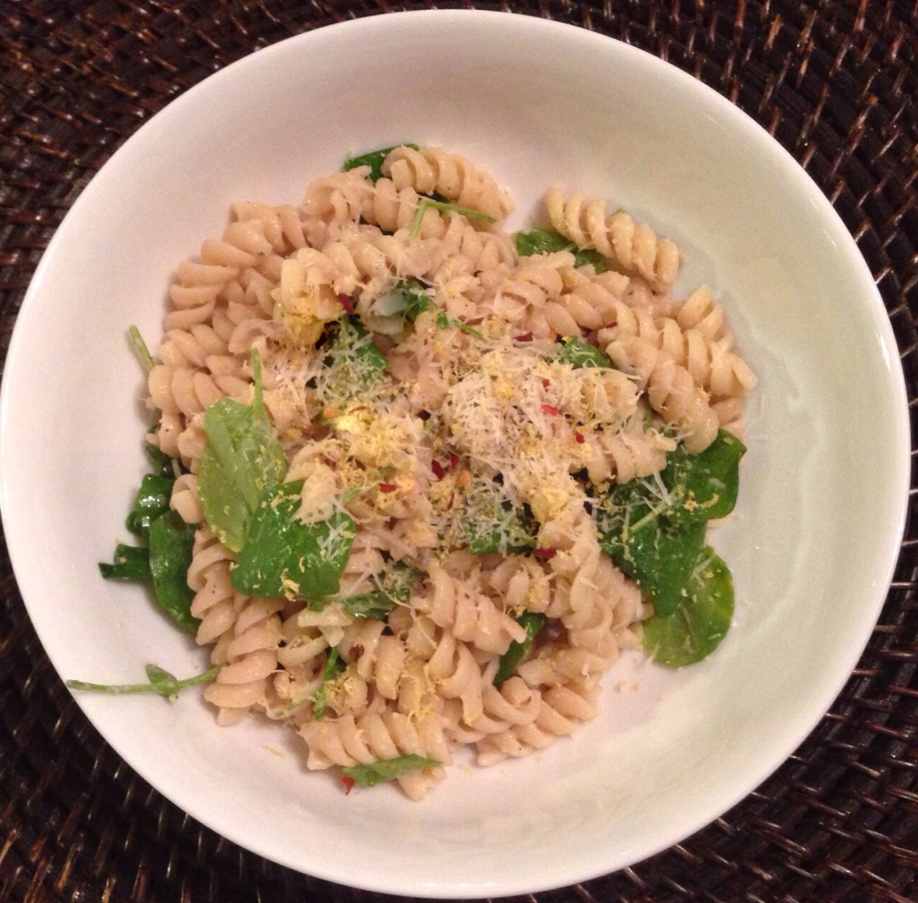 In a large bowl, toss the hot drained pasta with tuna sauce (thin with pasta water if necessary). Add arugula, lemon zest, salt & pepper, and remaining red-pepper flakes (see Tips*). Serve topped with fresh grated parmesan cheese and cracked pepper.