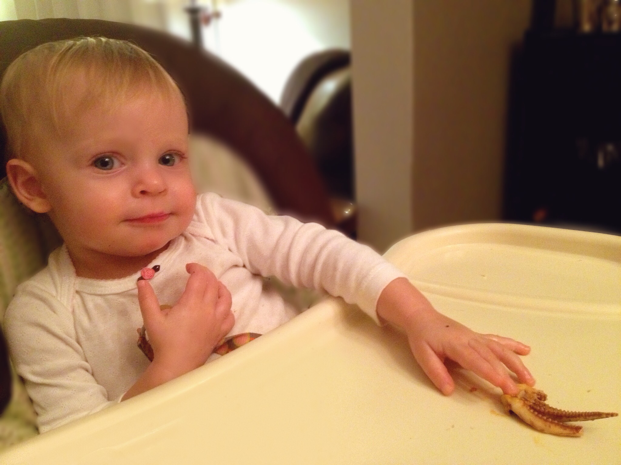 (Photo: My toddler at 17 months trying her first squid.)