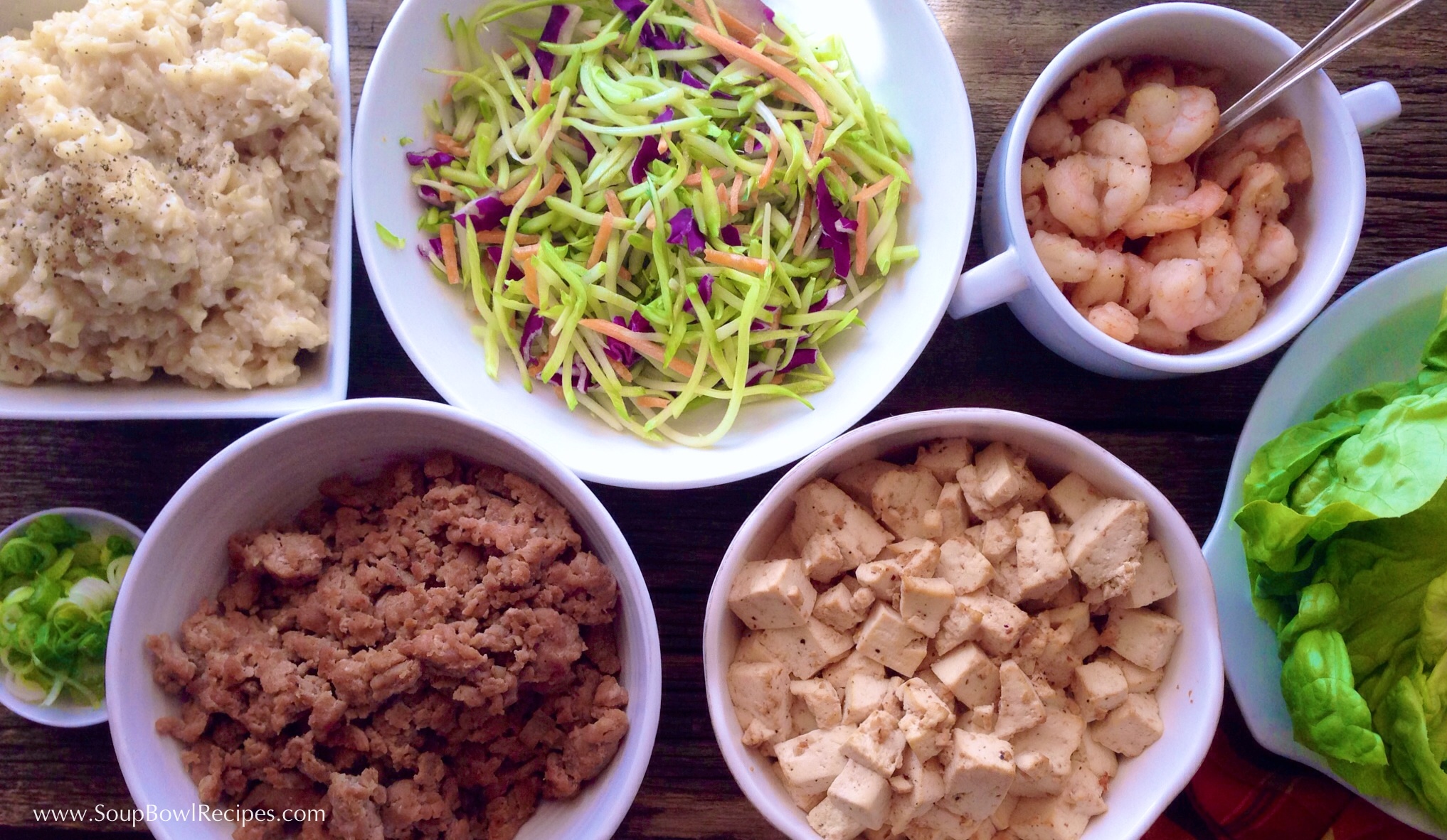 Place all serving bowls on the table and let everyone assemble their own wraps.
