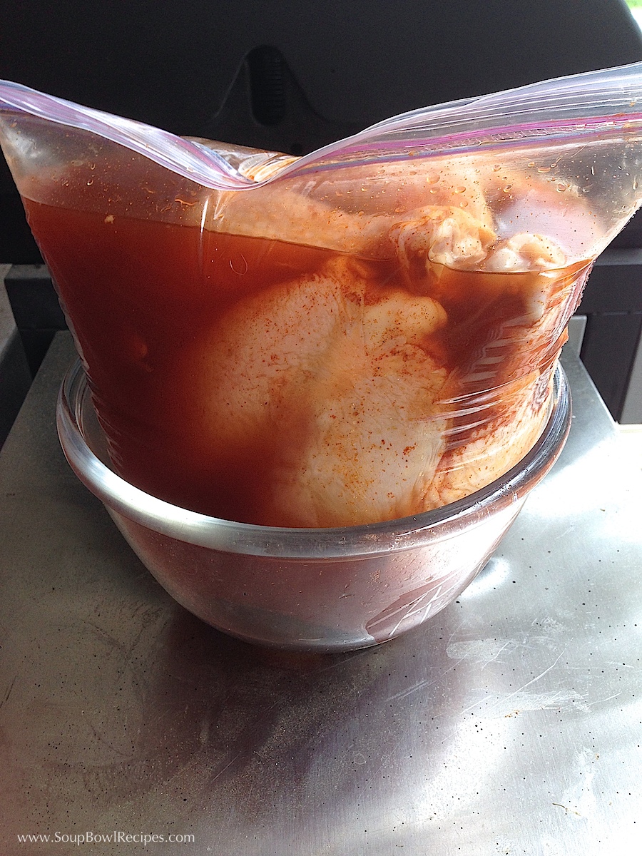 Using a large measuring cup, carefully pour brining liquid and garlic cloves into plastic bag with chicken until liquid almost reaches the top of the bag. Fold the edge of the bag back over and seal the zip lock. Place the bag and bowl in the refrigerator for 8-12 hours. (Brining the chicken is a key step in helping preserve its moisture and flavor under the high heat, so don’t skip this step, people! Seriously, it only takes about 5-10 minutes of prep time in the morning.)