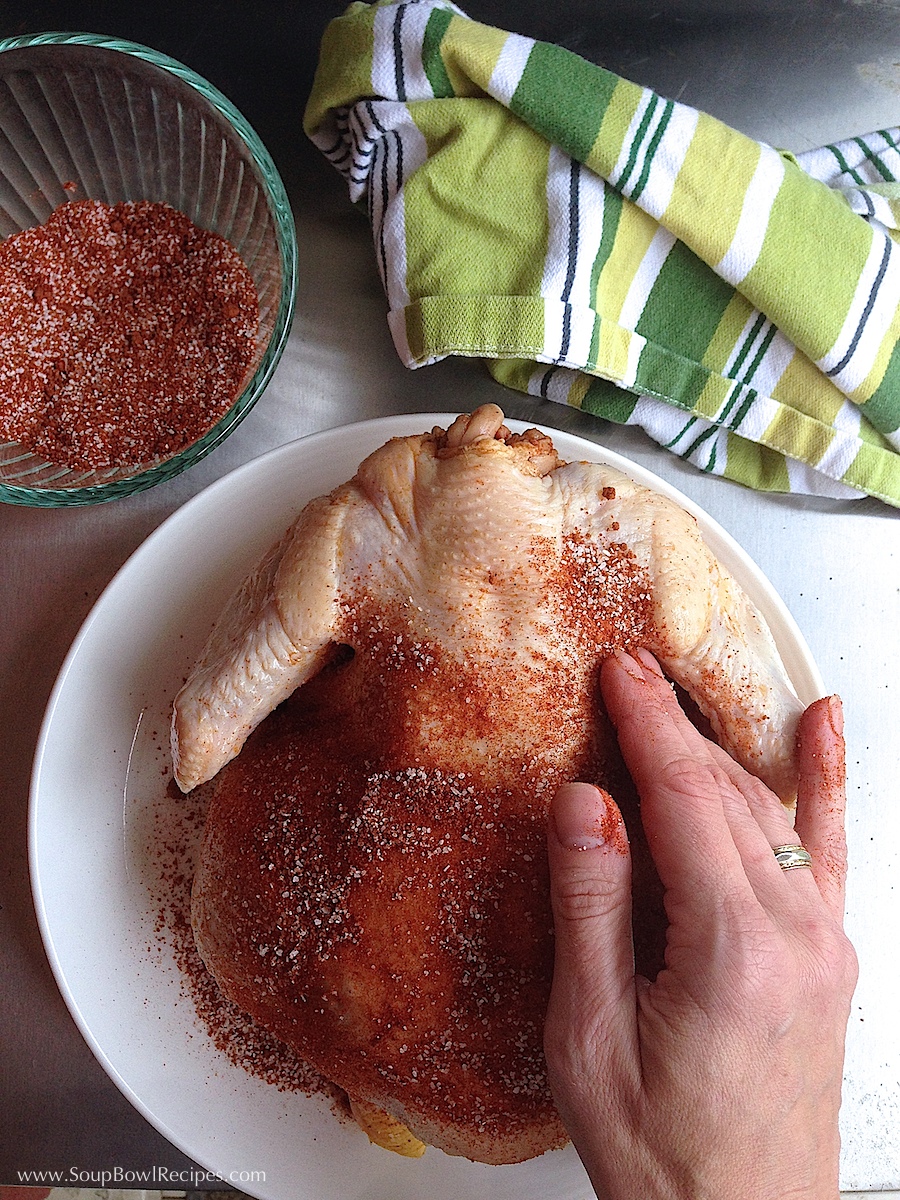 Rub the remaining spice mixture all over chicken, making sure to completely cover both sides, under wings, and in all the other cracks and crevices.