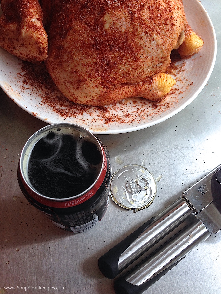 Meanwhile, use a can opener to remove the top of beer can and pour out ½ of the beer into a glass. (I strongly advise drinking the extra beer before proceeding.)